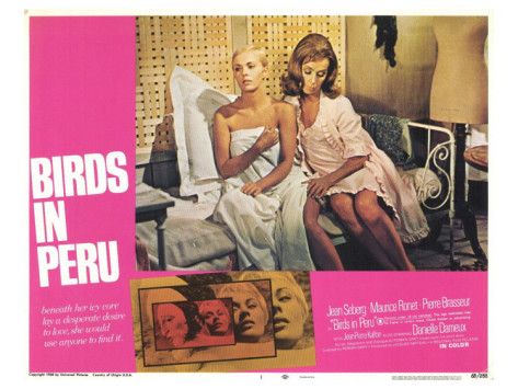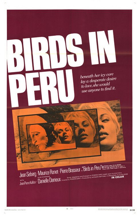 “In an interview a year ago, Romain Gary, the French novelist, said he had decided to make his debut as a director with the movie version of his short story, “Birds in Peru,” because professional filmmakers had “slaughtered” his “Roots of Heaven” and “Lady L.” Even though I haven’t read the original story, I doubt whether Gary has actually slaughtered “Birds in Peru.” He just lets it drown—slowly and rather pleasantly—in a sea of literary symbols, prettily photographed on the coasts of Spain and Mauritania. The French movie, with English subtitles, opened yesterday at the Little Carnegie Theater. The story is the kind of cryptic, cleanly simple one that can be interpreted in as many ways as a horoscope….Jean Seberg (Mrs. Gary) is a lovely but not very interesting Adriana. Her perfectly molded face and body, which have the look of youth preserved in a deep freeze, are tenderly explored by a camera that never finds anything more than an actress in the throes of simulated emotion. When, in a tight close-up, she sticks out her chin and looks to heaven, she doesn’t resemble a woman lost to an empty passion as much as a little girl about to lose a spelling bee. That fine old performer, Pierre Brasseur (“Quai des Brumes”), is nicely menacing as Adriana’s husband who revels in her illness. But Maurice Ronet hasn’t much to do as the man who saves her, only to let himself become part of her ménage of masochists. Danielle Darrieux is seen briefly as the madame. As a movie director, Gary is a very good writer; funny and sardonic. However, the mind exhausts his visual images—lots of Hialeah-like pictures of birds—much more quickly than his literary ones and, in the process picks up a lot of nonessential information, such as the fact that no matter how many times Miss Seberg is seduced, her hair seldom gets mussed….It is, of course, somewhat revealing of Gary. In his loving exploitation of Miss Seberg, he seems just a bit like the husband in the movie.”