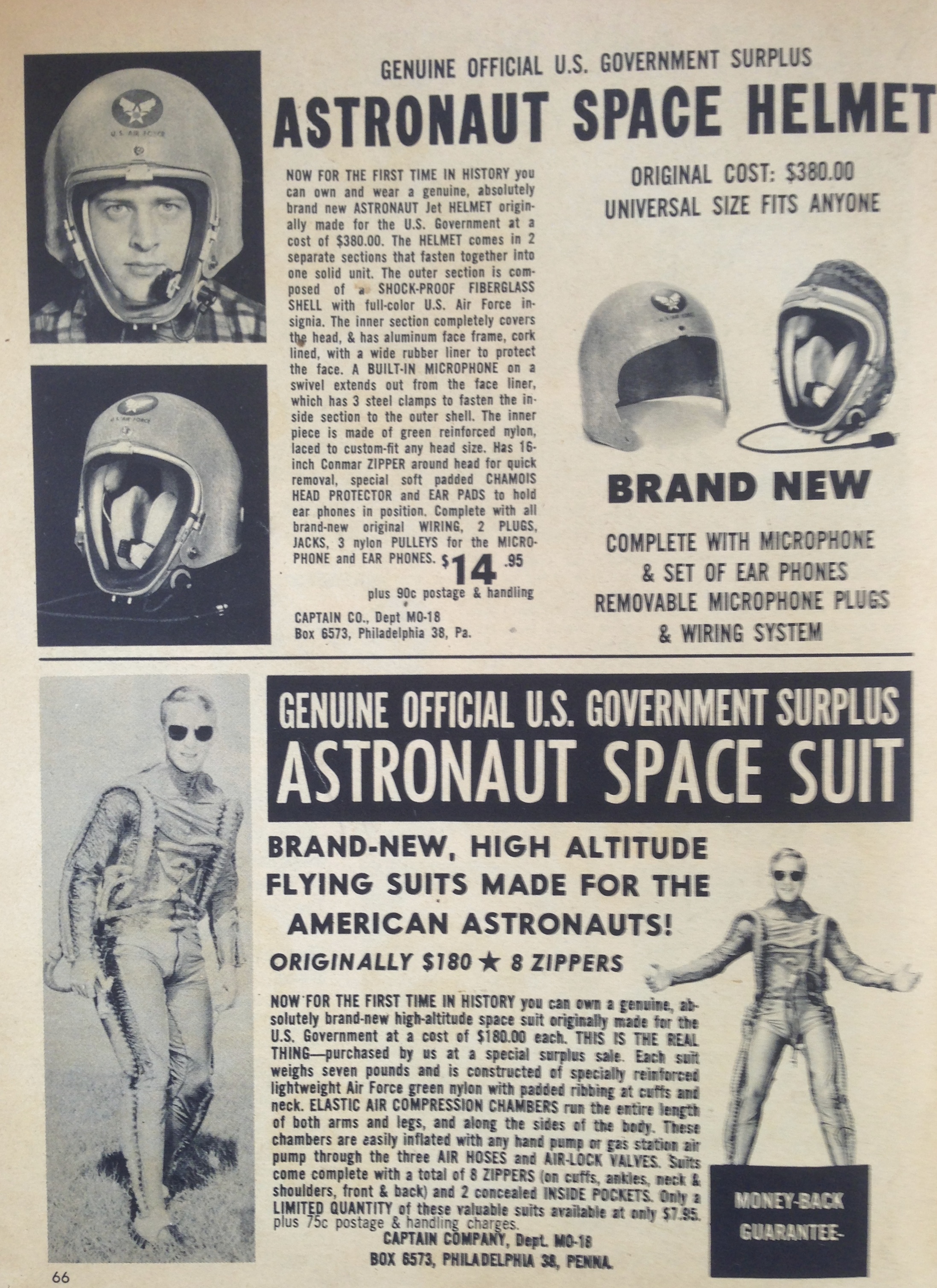 In some ways, buying that first issue (number 18, published July 1962) was a transformative experience for me. I poured over the thing, studying the photos, reading the articles and fantasizing about all the merchandise that was sold in the magazine’s back pages which my parents would deny me no matter how much I tried to negotiate – “Genuine Official U.S. Government Surplus Astronaut Space Suit,” “Own a Pair of Mated Live Sea Horses,” “Tremendous 30 Ft. Balloons,” “A Complete Set of 5 Different Monster Rings” and countless horror masks, 8mm movies, models and horror soundtrack albums.