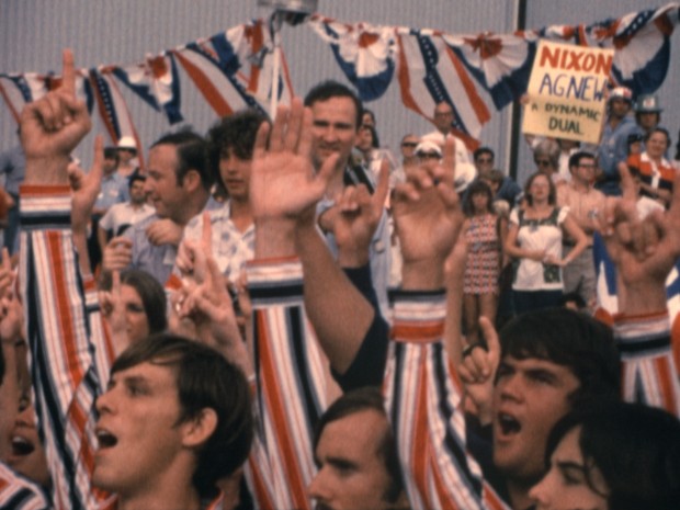 Our Nixon does have its share of surprises and unexpected moments that I haven’t encountered before in other documentaries on the subject. For example, there is footage of a White House social event in which the Ray Conniff Singers were scheduled to perform. Just before the concert begins, Carol Feraci, one of the singers pulls out a banner that reads “Stop the Killing” and holds it up. Someone tries to pull the banner out of her hands but she yanks it away and says into the microphone: “Mr. President, stop the bombing of human beings, animals and vegetation. You go to church on Sunday and pray to Jesus Christ. If Jesus Christ were in this room tonight you would not dare to drop another bomb. Bless the Berrigans and Daniel S. Ellsberg.” With that, she steps back in line and the Ray Conniff Singers launch into “Ma, She’s Making Eyes at Me.”