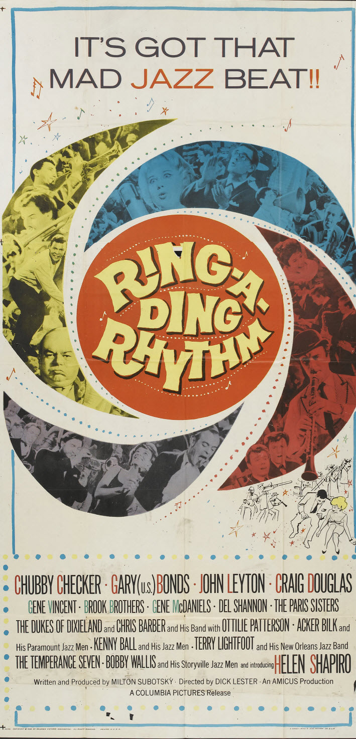 While producer Sam Katzman was busy exploiting the youth culture in the U.S. with quickie productions like Twist Around the Clock (1961) and Don’t Knock the Twist (1962), his contemporary Milton Subotsky was doing the same in England but with a different musical focus. London was in the midst of a British jazz revival driven by the music of New Orleans and Dixieland and this is the sound that inspired It’s Trad, Dad! (1962, aka Ring-a-Ding Rhythm), which also marks the feature film debut of Richard Lester, whose subsequent film was A Hard Day’s Night (1964) for The Beatles. Subotsky didn’t just stack the deck with jazz groups though; he also added a generous helping of current pop acts and even tried to scoop Katzman with showcasing Chubby Checker in the new novelty dance, the twist (Katzman still beat him to the punch with Twist Around the Clock which was released first in the U.S.).