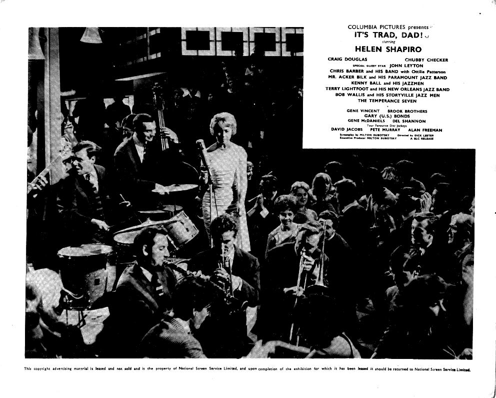 While producer Sam Katzman was busy exploiting the youth culture in the U.S. with quickie productions like Twist Around the Clock (1961) and Don’t Knock the Twist (1962), his contemporary Milton Subotsky was doing the same in England but with a different musical focus. London was in the midst of a British jazz revival driven by the music of New Orleans and Dixieland and this is the sound that inspired It’s Trad, Dad! (1962, aka Ring-a-Ding Rhythm), which also marks the feature film debut of Richard Lester, whose subsequent film was A Hard Day’s Night (1964) for The Beatles. Subotsky didn’t just stack the deck with jazz groups though; he also added a generous helping of current pop acts and even tried to scoop Katzman with showcasing Chubby Checker in the new novelty dance, the twist (Katzman still beat him to the punch with Twist Around the Clock which was released first in the U.S.).