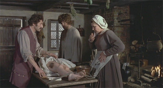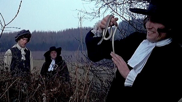 Unlike Reeves’s Witchfinder General, which was dominated by Vincent Price’s frighteningly intense performance as the infamous Matthew Hopkins, The Blood on Satan’s Claw was more ambiguous and disturbing in its approach to depictions of good and evil. For example, there is no conventional hero in Satan’s Claw (the original release title in England) and The Judge, with his rigid beliefs and dour manner, becomes the villagers’ savior by default. There is no other authority figure present that has the power or support to restore a rational sense of order to the village. The Judge’s approach to controlling the situation, however, is not dissimilar to a tyrant’s organized plan for ethnic cleansing.