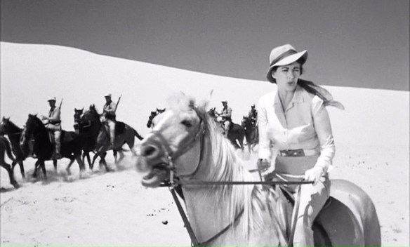 While Timbuktu was never meant to be anything other than a Saturday matinee potboiler and occasionally works on that level, Tourneur scholars and fans may find larger meanings here within the context of his entire career. It does share similarities with the ménage a trois set-up of his Great Day in the Morning [1956] and Appointment in Honduras [1953] and displays an obsession with time (a plot concern of Tourneur’s Night of the Demon [1957] and other films) from Conway’s self-engraved watch (“From Conway to Conway”) to the climactic race toward Timbuktu. The movie also traffics in its share of surreal metaphors, such as Conway substituting sewing machines for machine guns in one of his arms shipments.