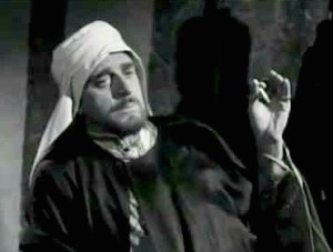 Just as damaging to the film’s credibility was a cast of swarthy-looking American extras, dressed up in robes and shoras, and pretending to be menacing Islamic fanatics. This foolishness was capped by having New York City native John Dehner play their leader. Dehner, who got his start as an animator at Walt Disney studios, switched to acting in the forties and played Palladin in the radio version of the TV hit, Have Gun, Will Travel and memorable supporting roles in such movies as 1958’s The Left Handed Gun (where he played sheriff Pat Garrett to Paul Newman’s Billy the Kid) and Anthony Mann’s Man of the West (1958).