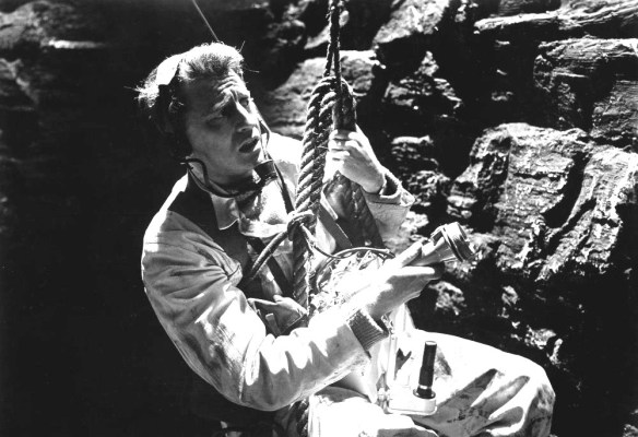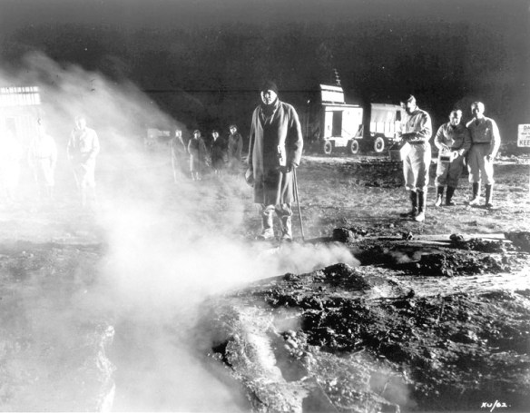 Dean Jagger (center) surveys the crack in the earth where an energy-eating blob emerged in X The Unknown (1956).