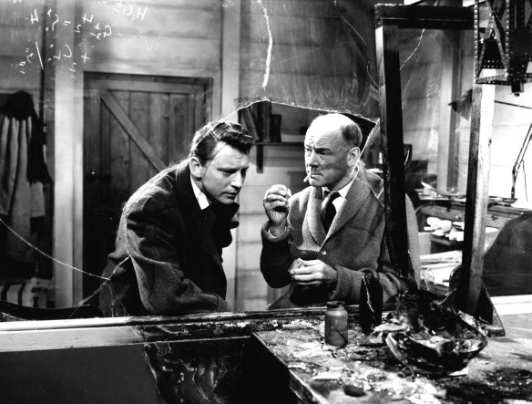 Dr. Adam Royston (Dean Jagger, right) shares his theory about a radioactive blob with a colleague in X The Unknown (1956).