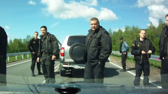A group of angry Russian men prepare to confront the driver of a car in a road rage segment of The Road Movie (2016).