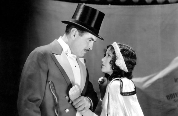 Dalton (Alan Roscoe), the circus ringmaster, tries to bully Mary (Joan Peers), the owner of the traveling fair in Rain or Shine (1930).