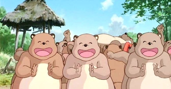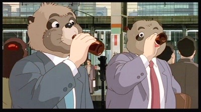 Despite touching on such diverse topics as eco-terrorism or species eradication, Pom Poko is frequently hilarious and rarely didactic in the way some allegories can be (Watership Down, Animal Farm). On another level the tanuki are all too human in their own behavior, reflecting all the faults of man – selfishness, laziness, procrastination, etc. – but also good qualities as well. By the way, the title refers to the sound the tanuki make when they use their bellies as drums.