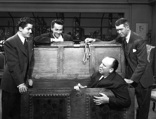 Rope (1948) Published April 22, 2018 at 600 × 459 in The Unforeseen Journey from Jean-Luc Godard’s 1 AM to D.A. Pennebaker’s 1 PM Alfred Hitchcock on the set of Rope (1948) with James Stewart (far right), Farley Granger (far left) and John Dall.