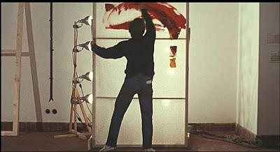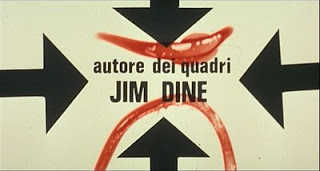 Dine had previously shown his work in 1964 at the Venice Biennale along with Robert Rauschenberg, Johns and Claes Oldenburg and Petri later traveled to London (where Dine was living) to meet the artist and “invited him to Cinecitta to paint around fifteen large canvases, all of which would appear in the film. Jim Dine was filmed while working so that actor Franco Nero could later replicate his gestures when portraying the film’s protagonist. Petri wanted Dine to stay in Italy to advise Nero and perhaps weigh in on some visual aspects of the film. However, the painter had to return to London for other commitments.” (from Writings on Cinema & Life: Elio Petri).
