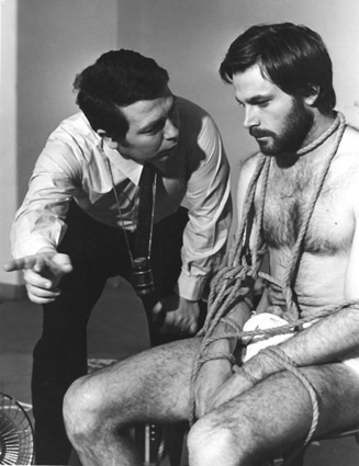 Director Elio Petri gives Franco Nero instructions for a scene outside a villa near Padua, Italy in A Quiet Place in the Country (1968).