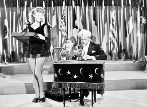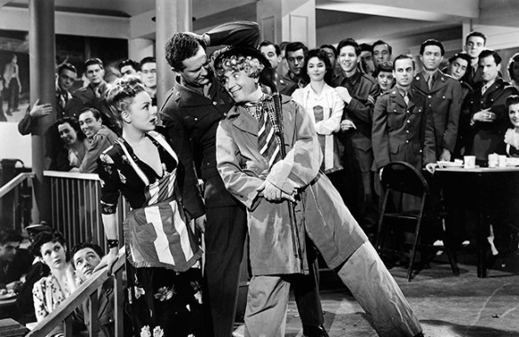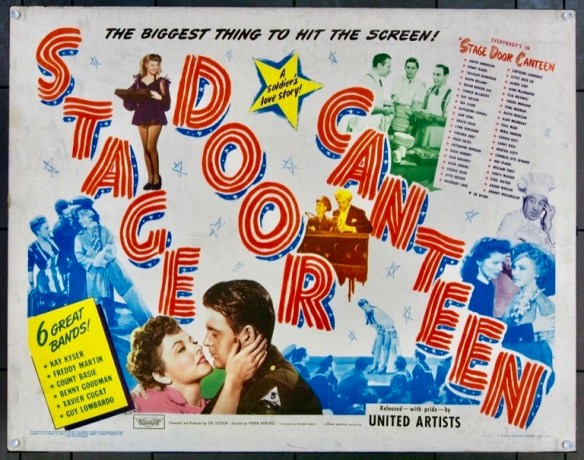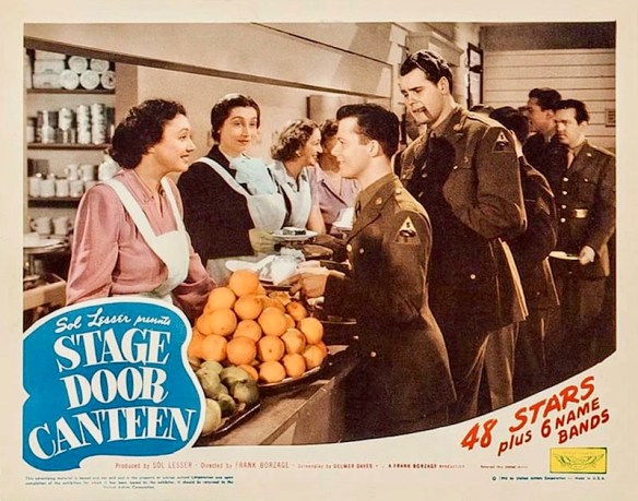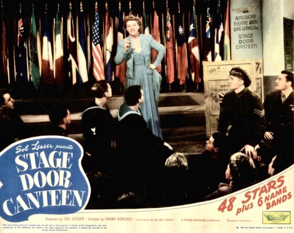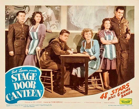 Between 1941 and 1945 as World War II engulfed the world most major studios in Hollywood demonstrated their patriotism by producing numerous flag-waving musicals in support of the troops and to raise money for the war effort. Warner Bros. was represented by This is the Army (1943), Thank Your Lucky Stars (1943) and Hollywood Canteen (1944); Paramount served up Star Spangled Rhythm (1942) and Here Come the Waves (1944); Universal had a major hit with Buck Privates (1941) starring Abbott & Costello and The Andrew Sisters; 20th-Century-Fox unveiled the mind-warping visual excess of Busby Berkeley’s The Gangs All Here (1943) and MGM brought their signature gloss and glamor to Thousands Cheer (1943) and Anchors Aweigh (1945). But probably one of the biggest extravaganzas of all in terms of star cameos and musical guests was Stage Door Canteen (1943), released by United Artists.