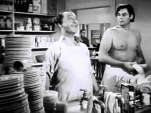 Katharine Hepburn shows up toward the end to give a keep-a-stiff-upper-lip speech to our heartbroken heroine and there’s also a surprising “gay” moment between Franklin Pangborn and Johnny Weissmuller in the kitchen as they wash dishes. Weissmuller decides it’s too hot to work in his shirt and strips down, prompting Pangborn to glance at Weissmuller’s chest and then pound his own, imitating the famous Tarzan yell.