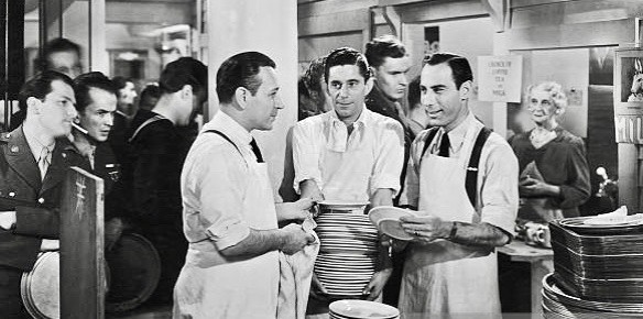 George Raft (center, facing right) pops up in a cameo role in Stage Door Canteen (1943), directed by Frank Borzage.