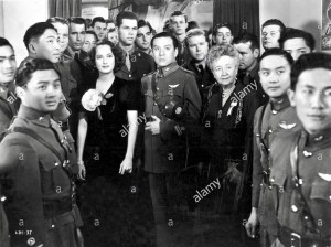 Merle Oberon (center) with Chinese troops and Dame May Whitty (on right) in Stage Door Canteen (1943), produced by Sol Lesser.