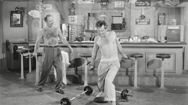 Shack Out on 101 (1955) Published July 19, 2018 at 650 × 366 in Commies at the Greasy Spoon Diner Keenan Wynn (left) and Lee Marvin compare pecs and weight lifting techniques in Shack Out on 101 (1955).