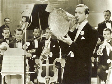 In the film, Ted is a saxophone player and acknowledged bandleader of a swing ensemble composed of his college buddies. When his lead vocalist develops a throat problem during their current band gig, Ted is faced with a dilemma – either find a new singer immediately or the band is out of work. As the only other member of the band with a half decent voice, Ted reluctantly steps into the vocalist’s spot but his singing is thin and lacks power; the clubgoers can barely hear him. Then, a drunk (Guy Kibbee) dances past the stage and jokingly hands him a megaphone. If it was intended as an insult, it has the reverse effect on Ted who suddenly gains confidence as he is able to stylize and project his voice.