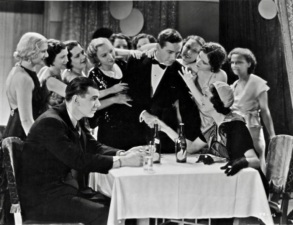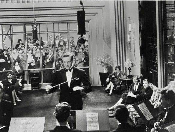 A film still from the Pre-Code comedy-drama Crooner (1932) starring David Manners (center), a singer with an adoring female fan base.