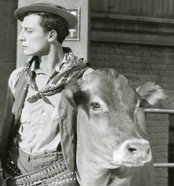 Buster Keaton plays a hapless cowpoke who tries to save a cow named Brown Eyes from the slaughterhouse in Go West (1925).