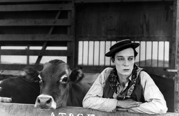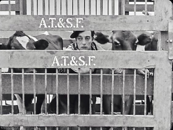 Buster Keaton plays a hapless cowpoke who tries to save a cow named Brown Eyes from the slaughterhouse in Go West (1925).
