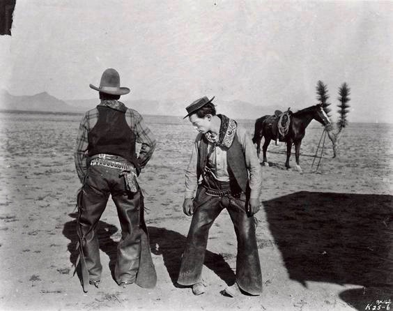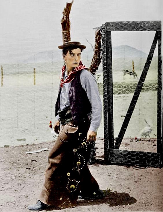 Buster Keaton tries to imitate the way a real cowboy walks in the silent comedy, Go West (1925), co-starring Howard Truesdale as a ranch owner.