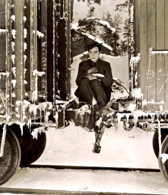 Keaton’s innate understanding of his craft and appeal was best expressed by James Agee when he wrote, “Keaton’s face ranked almost with Lincoln’s as an early American archetype: it was haunting, handsome, almost beautiful, yet it was irreducibly funny; he improved matters by topping it off with a deadly horizontal hat, as flat and thin as a phonograph record…No other comedian could do as much with the dead pan. He used this great, sad, motionless face to suggest various related things: a one-track mind near the track’s end of pure insanity; mulish imperturbability under the wildest of circumstances, how dead a human being can get and still be alive; an awe-inspiring sort of patience and power to endure, proper in granite but uncanny in flesh and blood. Everything that he was and did bore out this rigid face and played laughs against it.”