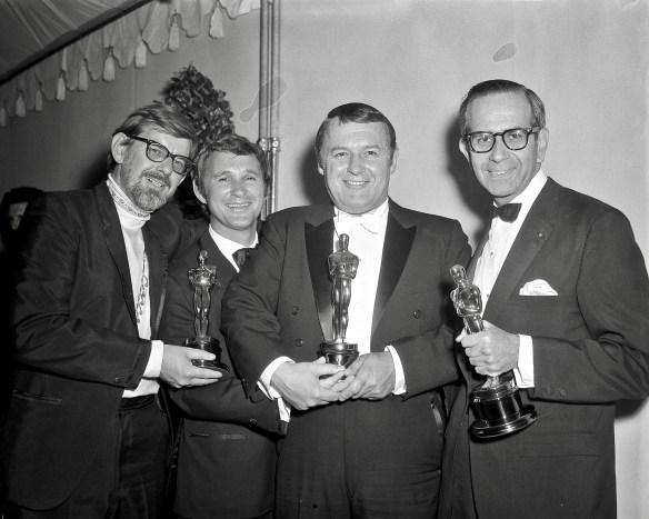 Left to right: Hal Ashby, Norman Jewison, Rod Steiger and producer Walter Mirisch on Oscar night displaying their awards for In the Heat of the Night (1967).
