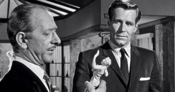 Vaughn Taylor (left) & Philip Carey discuss the strange statuette that might be a clue to a murderer in Screaming Mimi (1958).