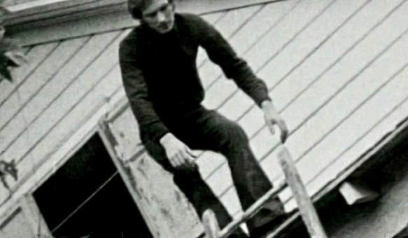 Bas Jan Ader prepares to topple off a rooftop in the 2007 documentary, Here is Always Somewhere Else, directed by Rene Daalder.
