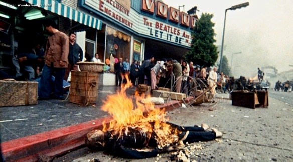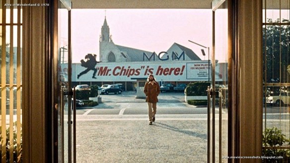 And despite the film’s frequent flights of fantasy, Alex in Wonderland is grounded in reality by the numerous Los Angeles locations used throughout the movie; among these are Hollywood High, the MGM studio lot where the 1968 musical version of Goodbye, Mr. Chips is being promoted on huge banners, and Hollywood Boulevard, where we glimpse the Musso and Frank Grill, the Vogue Theater (it closed in 1995), the Supply Sergeant, Max Factor and other familiar landmarks.