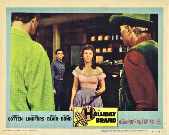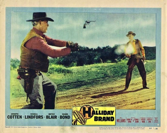 The cast of The Halliday Brand was initially announced in an article in The Hollywood Reporter in March 1956 and included Ida Lupino, Howard Duff, Charles Bickford and “either Rita Moreno or Debra Paget.” The article also mentioned Robert Stevenson as a possible director. None of those people ended up being involved in the production but the mention of Ida Lupino may have been due to the fact that Halliday producer Collier Young was married to her from 1948-1951 and continued to work with her and her next husband, actor Howard Duff, throughout the fifties.