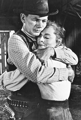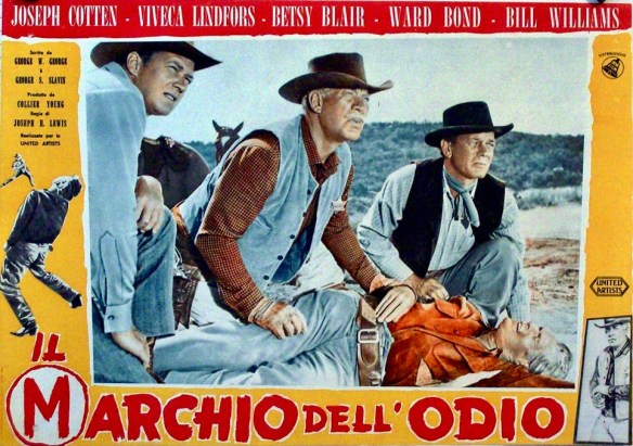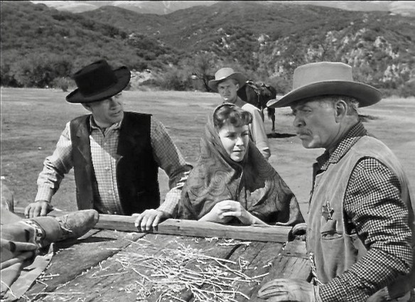 In the foreground from left to right are Joseph Cotten, Betsy Blair and Ward Bond in The Halliday Brand (1957), a western directed by Joseph H. Lewis (Gun Crazy).
