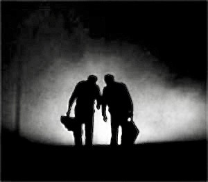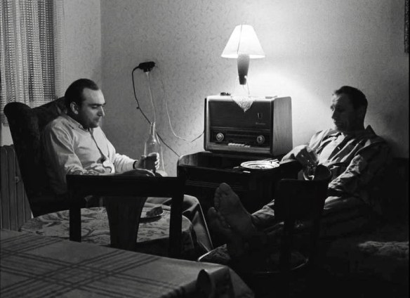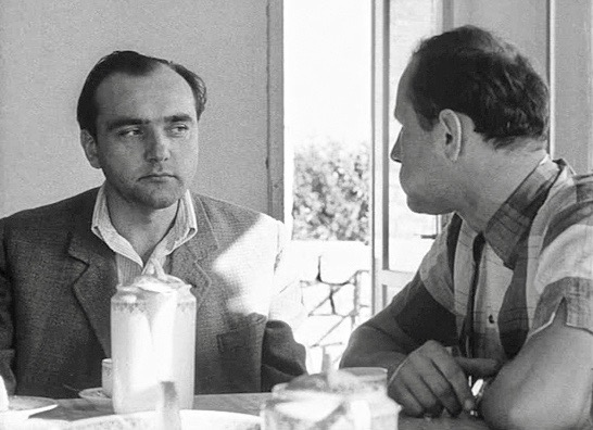Bambas (Karel Blazek, left) and Peter (Zdenek Bezusek) are old friends who are reunited after many years in the bittersweet Czech New Wave classic, Intimate Lighting (1965), directed by Ivan Passer.