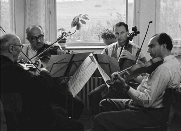 Peter (Zdenek Bezusek, second from right) and Bambas (Karel Blazek, right) rehearse with their quartet members in Ivan Passer’s Intimate Lighting (1965).