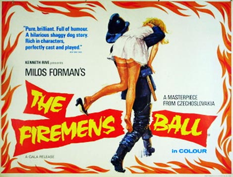 These subtle shifts in tone are always unpredictable but true to life and often express a distinctive Czech sense of humor, which is usually delivered with a quirky double twist. A perfect example of this occurs toward the end of Foreman’s The Fireman’s Ball when the firemen arrive too late from their ceremonial party to stop a raging fire from destroying an elderly man’s home. As the old man watches helplessly in the freezing winter weather, the firemen move him closer to his flaming house so he’ll be warm. Then, realizing the insensitivity of that gesture, turn his chair around so his back faces the burning wreckage.