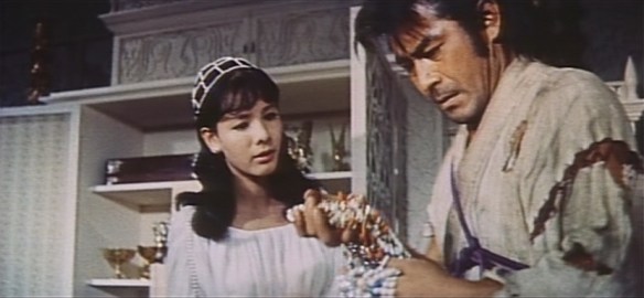 Miwa the rebel leader (Kumi Mizuno, left) and Luzon (Toshiro Mifune) are stuck in a dicey situation in The Lost World of Sinbad (1963), directed by Senkichi Taniguchi.