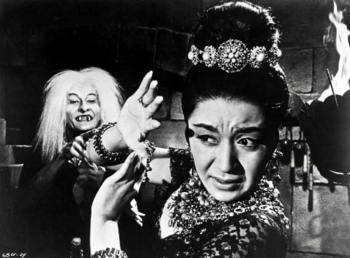 Sobei (Mitsuko Kusabue, right) is afraid to meet the gaze of the gorgon-like Granny (played by Male actor Hideyo Amamoto in drag) in The Lost World of Sinbad (1963).