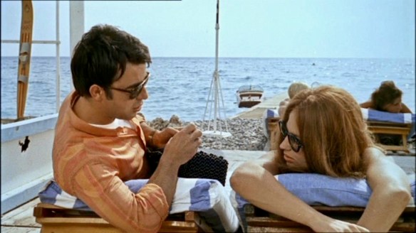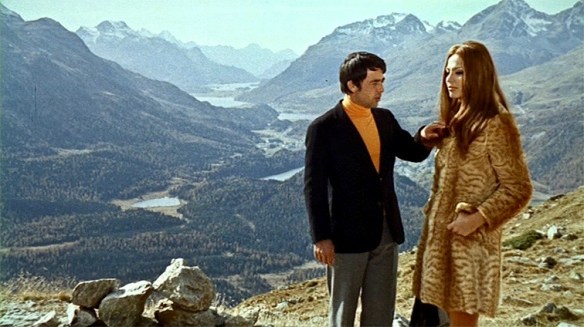 Roger (Gerard Blain) and Laura (Ira von Furstenbergh discuss their extortion plan amid glamorous European resorts in Negresco – Eine Todliche Affare (1968).