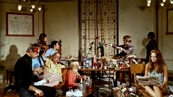The spontaneous pot party scene is about to begin at the villa of Borell (Serge Marquand, upper right) with music by Klaus Doldinger. (from Negresco – Eine Todliche Affare, 1968).