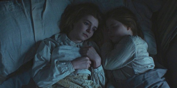 Gwen (Eleanor Worthington-Cox, left) and her sister Mari (Jodie Innes) snuggle in bed in the atmospheric period drama Gwen (2018), directed by William McGregor.