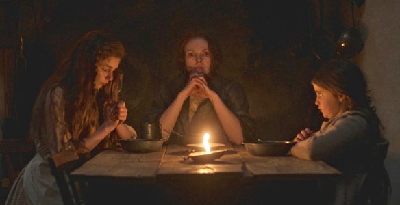 Gwen (Eleanor Worthington-Cox, left), her mother (Maxine Peake) and sister (Jodie Innes) brood over their misfortune by candlelight in Gwen (2018).
