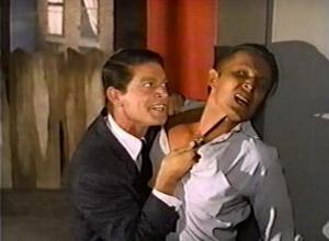 Frankie Fane (Stephen Boyd, center) and Hymie Kelly (Tony Bennett) cower at the threats of a small town sheriff (Broderick Crawford) in The Oscar (1966).