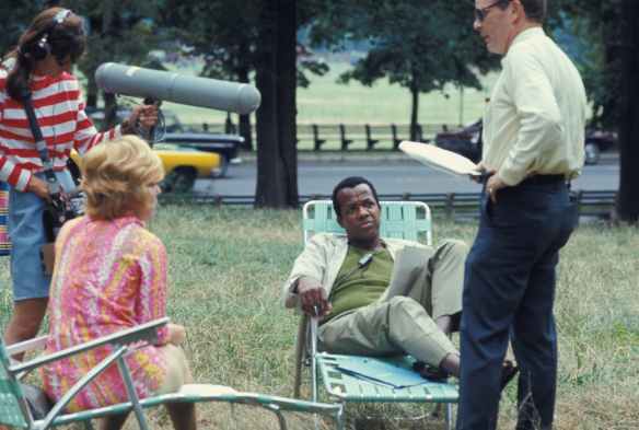 Director William Greaves in Central Park filming Symbiopsychotaxiplasm Take One (1968) with two of his actors.
