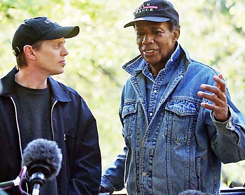 SYMBIOPSYCHOTAXIPLASM take 2 1/2 (2005) Published November 15, 2019 at 500 × 397 in William Greaves: Pushing Boundaries Director Bill Greaves (right) on set near Strawberry Fields in Central Park with Steve Buscemi for the film Symbiopsychotaxiplasm Take 2 1/2 (2005). Photo by Susan Stava.