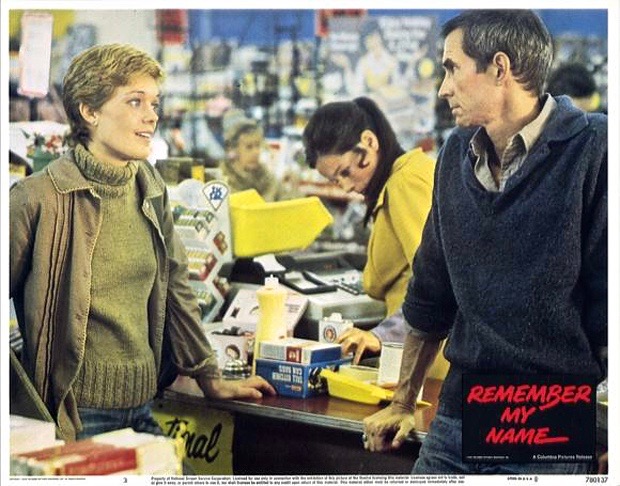 Remember My Name (1978) Published December 12, 2019 at 620 × 486 in Payback is a Bitch Husband and wife Barbara (Berry Berenson) and Neil (Anthony Perkins) talk in the checkout line while employee Emily (Geraldine Chaplin, background) tries to be inconspicuous in Remember My Name (1978).