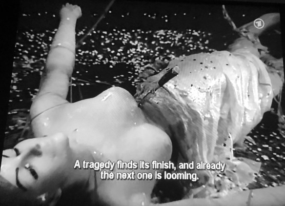 What gives the movie a solid jolt of energy and immediacy is Thiele’s almost breathless pacing and the dazzling black and white cinematography of Wolf Wirth, who appears to have adopted several visual techniques used previously by French New Wave directors. There are street scenes in real locations and shaky hand-held camera movements that have a documentary-like drama. Floor level shots introduce imposing characters while overhead views emphasize something decadent like Marion lying drunk on the floor while masked revelers dance around her. Thiele even has Wirth place actors in front of obvious rear screen projections to make satiric points about what is being said. In one scene, Axel even breaks the fourth wall when he addresses the audience and comments about the actress Najda Tiller while Marion looks on smiling.