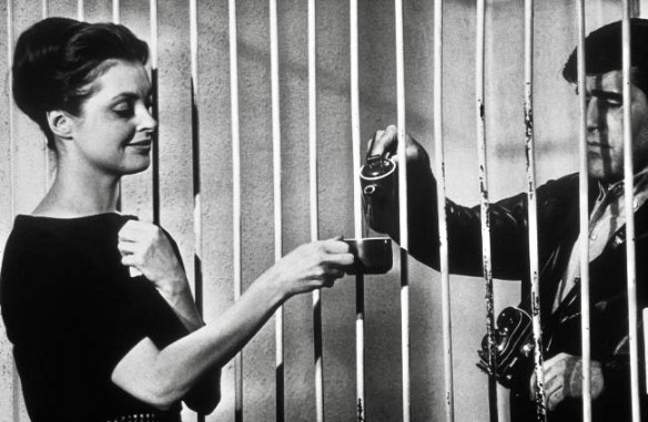 Marion (Nadja Tiller) tells all to tabloid journalist Axel (Mario Adorf) during her imprisonment in Moral 63, directed by Rolf Thiele.