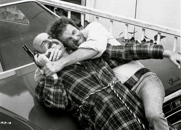 Peter Boyle and James Caan struggle over a gun in the comedy-mystery Slither (1973), directed by Howard Zieff,