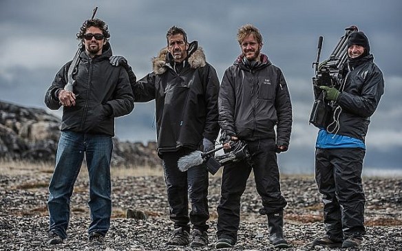 The crew that accompanies photographer Amos Nachoum on his search for polar bears in Picture of His Life (2019) includes (from left) Billy Kaludjak, Adam Ravetch, and directors Yonatan Nir and Dani Menkin.
